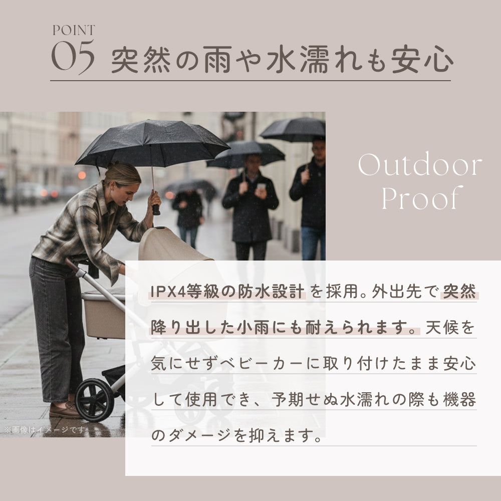 ・SleepytrollはIPX4(生活防水)の防滴仕様となっています。小雨程度の雨でも長時間の使用または強い雨の中では使用しないでください。